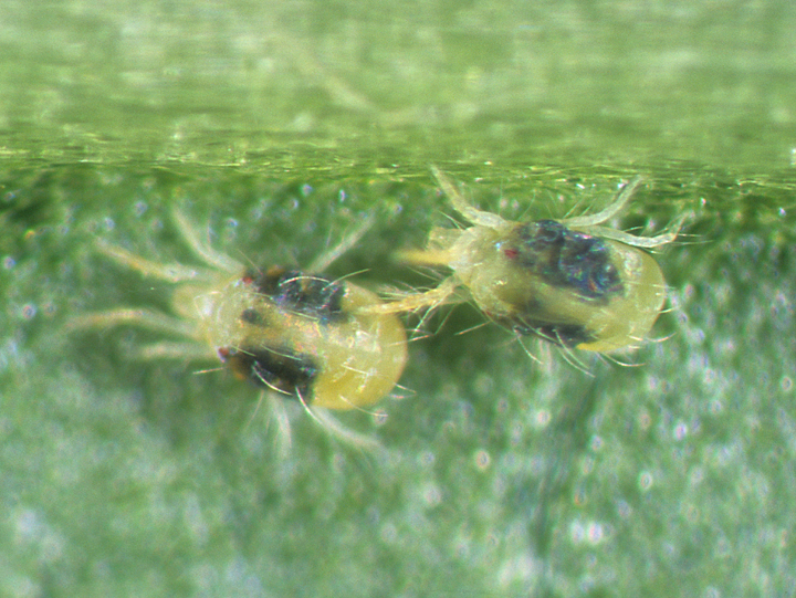 Two-Spotted Spider Mites (Tetranychus urticae) under magnification. There are 5 different species of mites that are present in the Pacific Northwest. They are very similar and are managed using the same methods.