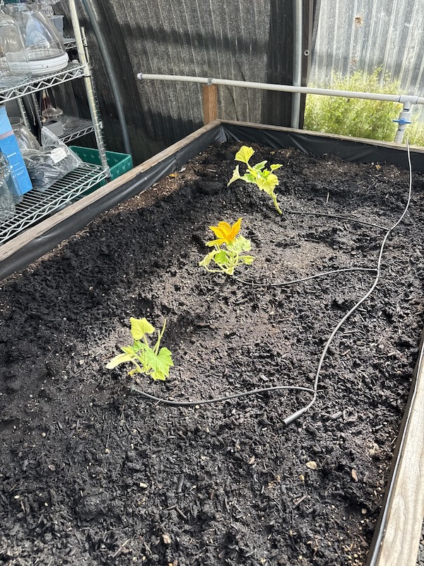 It's a big raised bed, but 3 zuchini plants will fill up this space in no time. Note the drip lines. They are on a timer that will provide just the right amount of water with no waste.