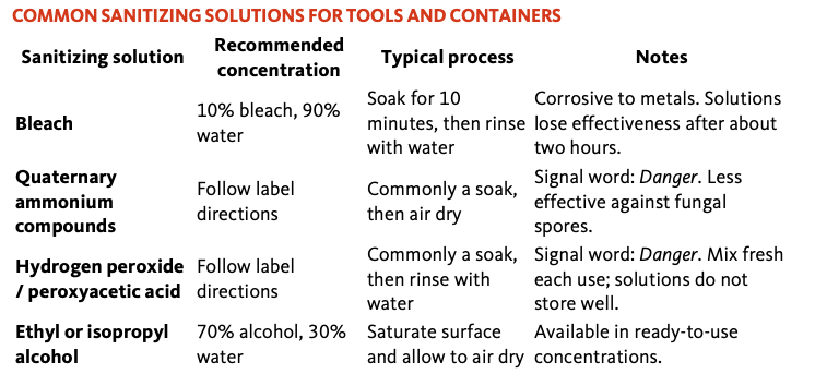 Nursery pots and garden tools are meant to last more than one season. Unfortunately, some plant diseases, pests, and pathogens can also persist on these items from one season to the next. Fungal spores, bacterial films, and even virus particles may remain on soil residues or in small crevices in tools and containers. At the start of the season, carefully disinfect your garden tools to reduce the risk of carrying problems into the new growing cycle. It’s also important to disinfect shears and secateurs between plants, since the blades can pick up a plant virus from one plant and mechanically transmit it to the next.